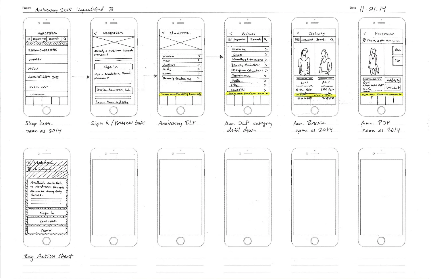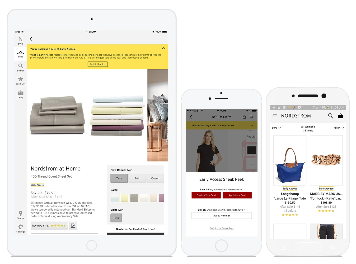 Nordstrom's largest sale event, the Anniversary Sale, is held each year in July. Prior to 2015, only Nordstrom cardholders could browse and purchase sale items during Early Access, while non-cardholders had to wait a week until the sale opened up to the public. Product management and UX were tasked to design a new experience that allowed everyone to view Anniversary Sale items while gating purchases to only Nordstrom cardholders during Early Access. I was focused on creating a new mobile app experience for iOS and Android while closely collaborating with my desktop UX counterpart, to ensure a cohesive experience across channels.