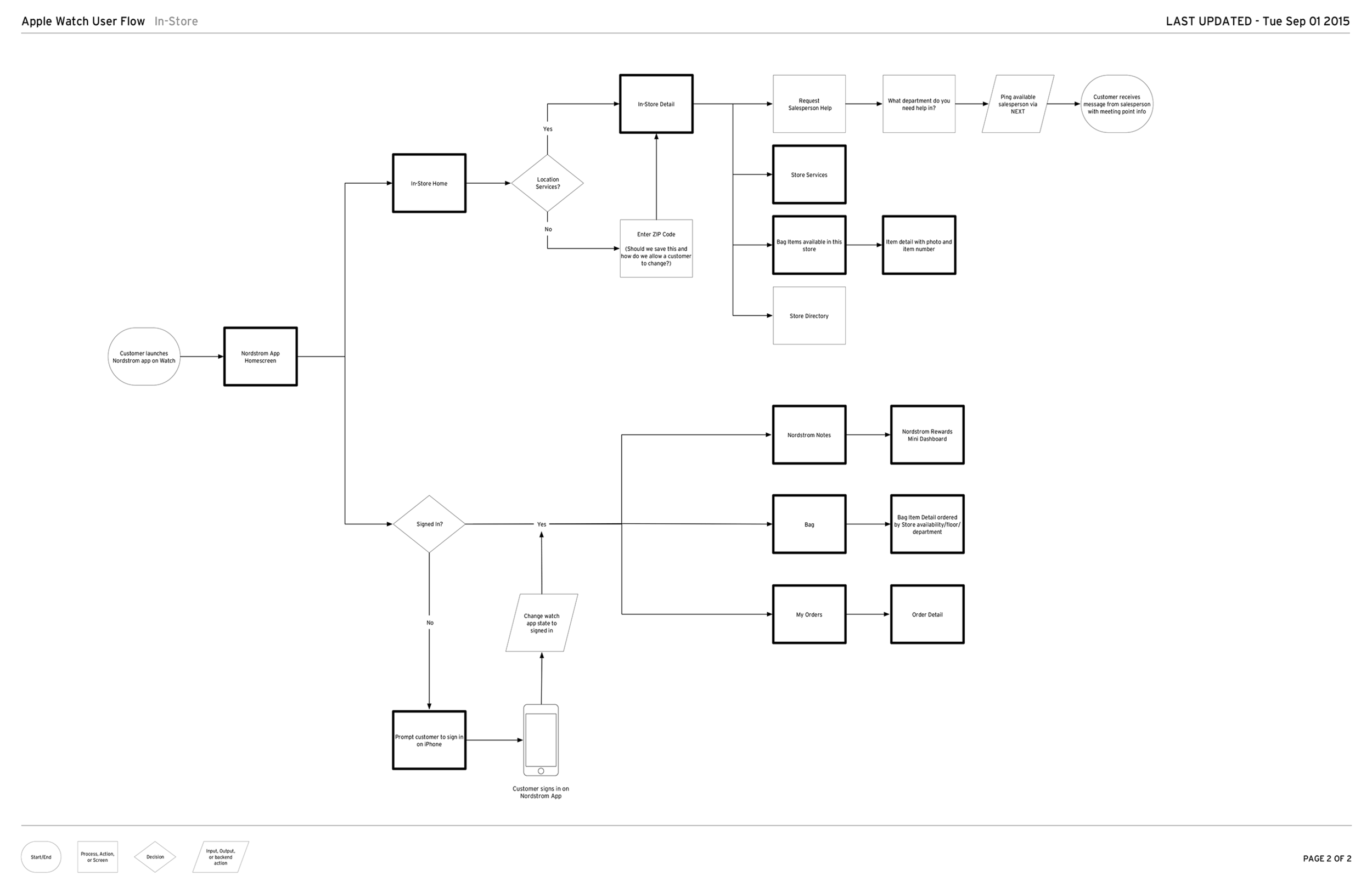 In order to help my development partner understand how the screens would flow, I created user flows to illustrate how the watch app screens connected to each other and how they changed depending on the customer location.